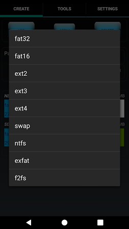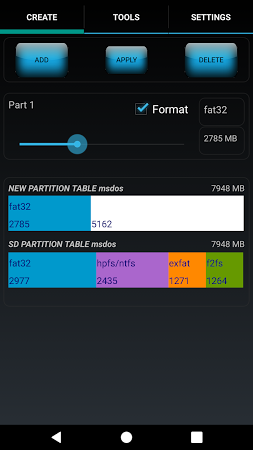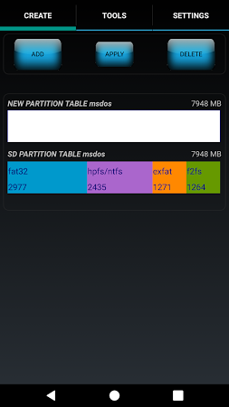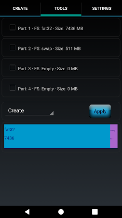 Create partitions and administer them in your SD Card or USB device. By creating a swap partition you can easily put more RAM at the disposal of your device. Repairing some damaged SD Card and scanning for bad blocks is also possible with this application.