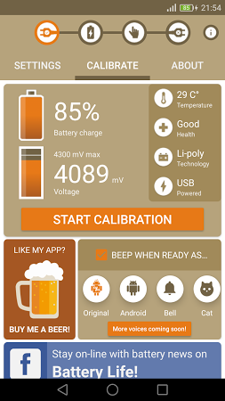 Get detailed information about your mobile device's battery and recalibrate it. The app displays the voltage level of the battery, sends a notification when the smartphone or table is fully charged and shows an accurate battery indicator. It also includes a few personal themes to choose from.