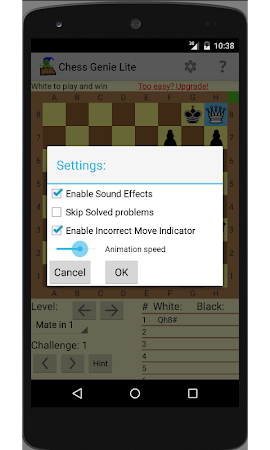 Improve your chess playing skills. Play chess on your Android device and have all your moves analyzed. View all your incorrect moves, undo moves, get back to previously unsolved problems, use multiple hints suggesting moves, and tweak the animation speed parameters.