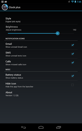 Places a customizable clock on the device's screen saver. Change the style of the digits and modify the brightness level. Choose whether you want additional information such as battery status, next alarm time, the current date or Gmail/SMS/call notifications to be displayed along with the clock or not.