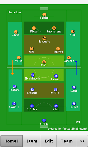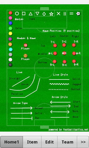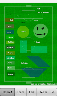 A tactical soccer analyzer. Create diagrams and plans for a football match, create and save images with visual representation, store plans for further editing, etc. The visual markers include lines, curves, circles, rectangles and unique shapes to represent the layout of a field and team placement.