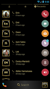 A custom theme for a phone dialer and contact manager. Replace the standard elements of a smartphone interface design with black glossy buttons and golden frames. View the phonebook and resize the windows and fonts. The utility automatically fits the replaced elements to new specifications.