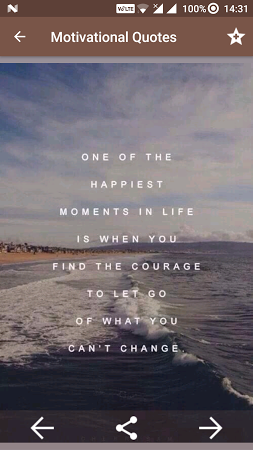 Collection of motivational quotes from great minds. Wallpapers and images with motivational messages are also included. More than 1000 quotes are available. It features the ability to save quotes as favorites and quickly browse through these bookmarks. Sharing quotes is also possible.