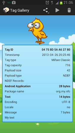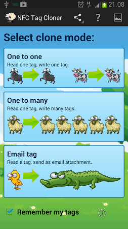 NFC tag cloning app. It supports two cloning modes, one that writes one tag and one that writes multiple tags. Emailing tags is also supported, as well as optionally remembering NFC tag data for later use. Supported NFC tags include all tags types using standard NDEF content, Mifare Ultralight, and Mifare Classic.