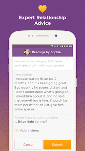 Get tips on your relationships from psychic advisors and fortune tellers. Type in your questions or leave a video recorded via your phone’s video camera and receive a reply within 24 hours or sooner. Get consultation in a broad range of subjects, including money, career, love, relationships, luck, spiritual connections, and so on.