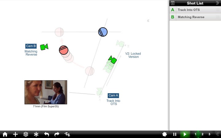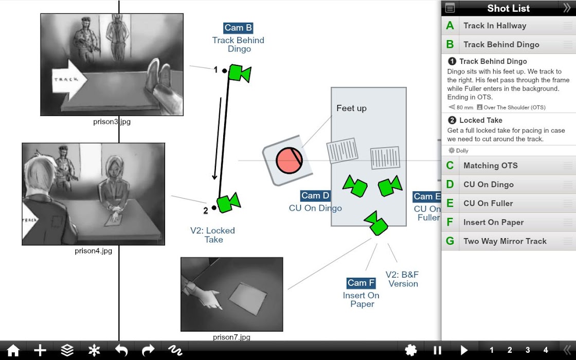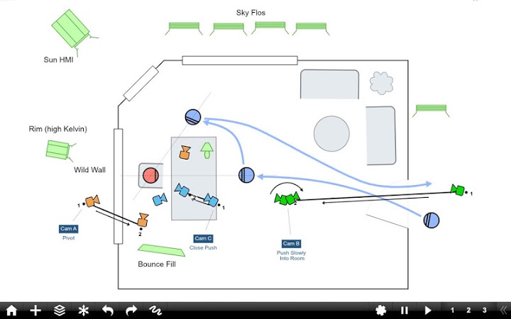 Create diagrams to get the perfect shots for your movie or video project. Factor in the position of the cameras, the placement of the lights and where the actors should be, then animate their movements as the scene progresses. Create floor plans and add text instructions for each shot so that your crew will know exactly what to do at any given time. The app is mostly useful for movie directors and DPs.
