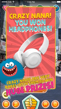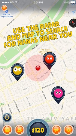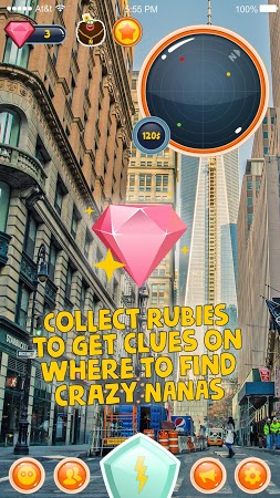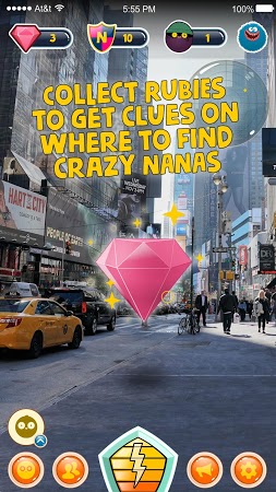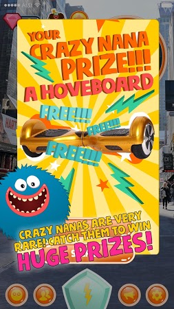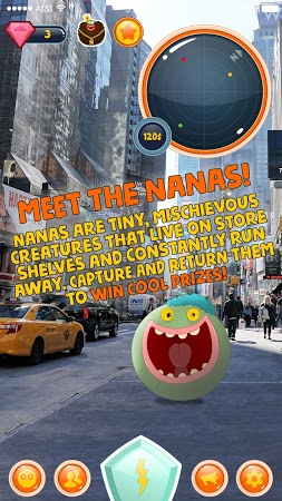 Capture colored round creatures nanas and get them back to the stores. Use the radar and map to look for nanas on the streets of your location, get clues by gathering rubies, and receive rewards for returning the captured creatures. Catch rare nanas and get big prizes like a hoverboard.