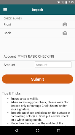 Assess your Vantage Credit Union account and manage banking data on your phone. Check your balance, send money to other accounts, pay your bills, process payments without sending paper checks, access your transaction history, and view check images. Check the locations of the nearest bank branches and ATMs.